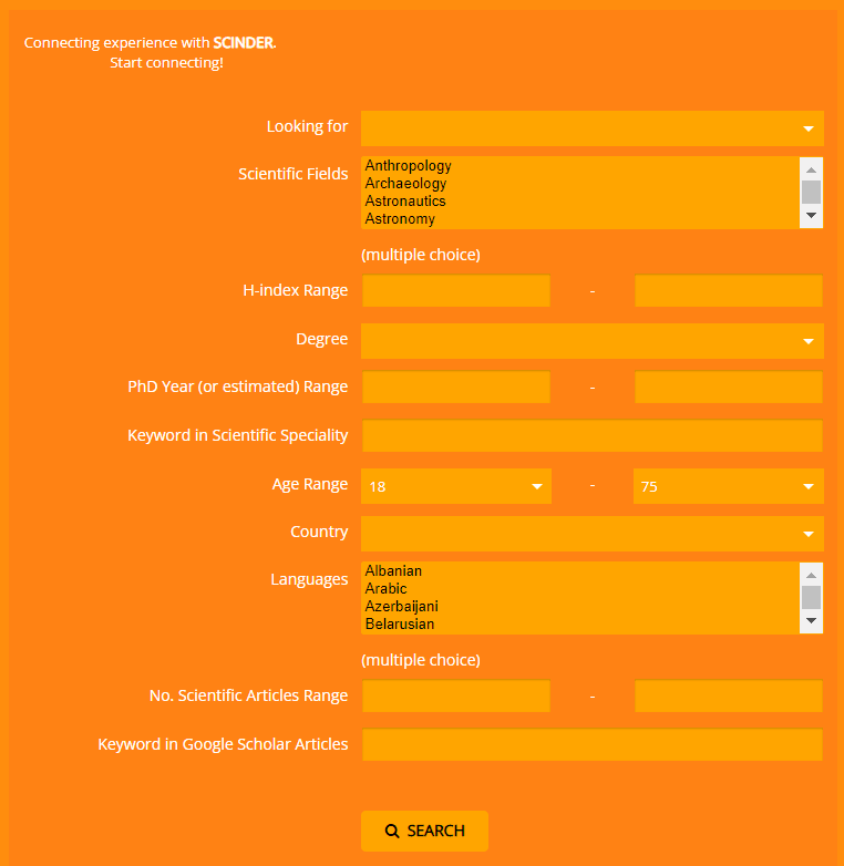 On the main page of our platform, you will find an initial search panel that allows you to filter users based on a set of specific criteria. Through this panel, you can make an initial search for users considering a variety of factors, such as the type of profile you are looking for, the scientific fields you would like the other user to have in common with you, their h-index, their PhD year (or estimated), age, scientific speciality, geographic location, languages, and many other criteria that may be of interest for your initial search.