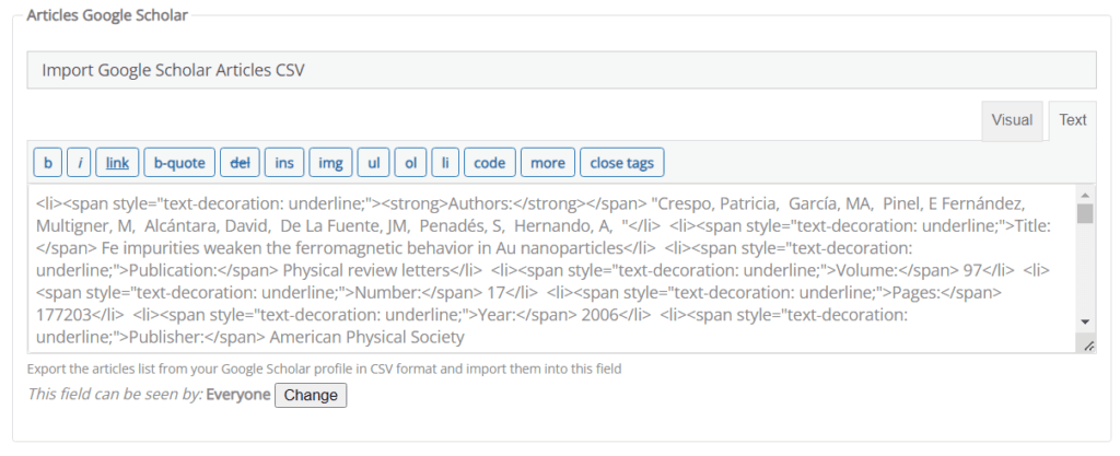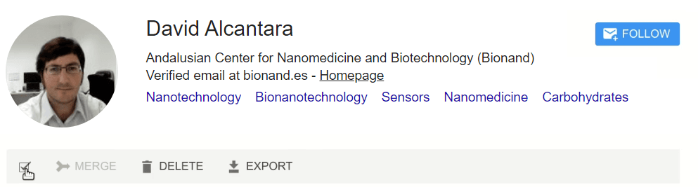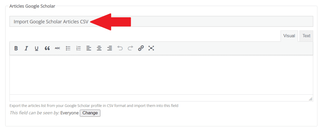 In your profile, within the “Edit” section, you will find a specific category called ‘Researcher Profile’. In this category, there is a field called ‘Articles Google Scholar’, designed for you to import information about your Google Scholar Articles in a file with the appropriate format with just clicking a button.